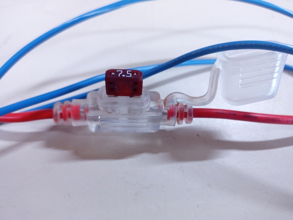 The positive wire will also incorporate an automotive fuse holder, housing a 7.5 amp fuse. This fuse serves as an important safety feature, protecting our system from overcurrent. From the fuse holder, the wire will go to one side of a toggle switch, allowing us to easily turn the system on and off to preserve the battery when it’s not in use.